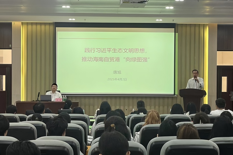 唐旭以“践行习近平生态文明思想,推动海南自贸港‘向绿图强’”为主题,将中国共产党关于物质文明和精神文明到生态文明的提出历程、生态文明提出的历史背景、以及为什么说习近平生态文明思想是伟大的等三个方面,对习近平生态文明思想的丰富内涵做了系统解读,围绕“美丽中国”“两山理论”“双碳目标”等关键词,重点阐述了习近平生态文明思想提出的重要性和重大意义。授课最后,唐旭指出,生态文明建设具有复杂性、艰巨性与长期性,新时代青年责任重大、使命光荣,要彰显使命与担当,增强做中国人的志气、骨气、底气,不负时代,不负韶华,不负党和人民的殷切期望!